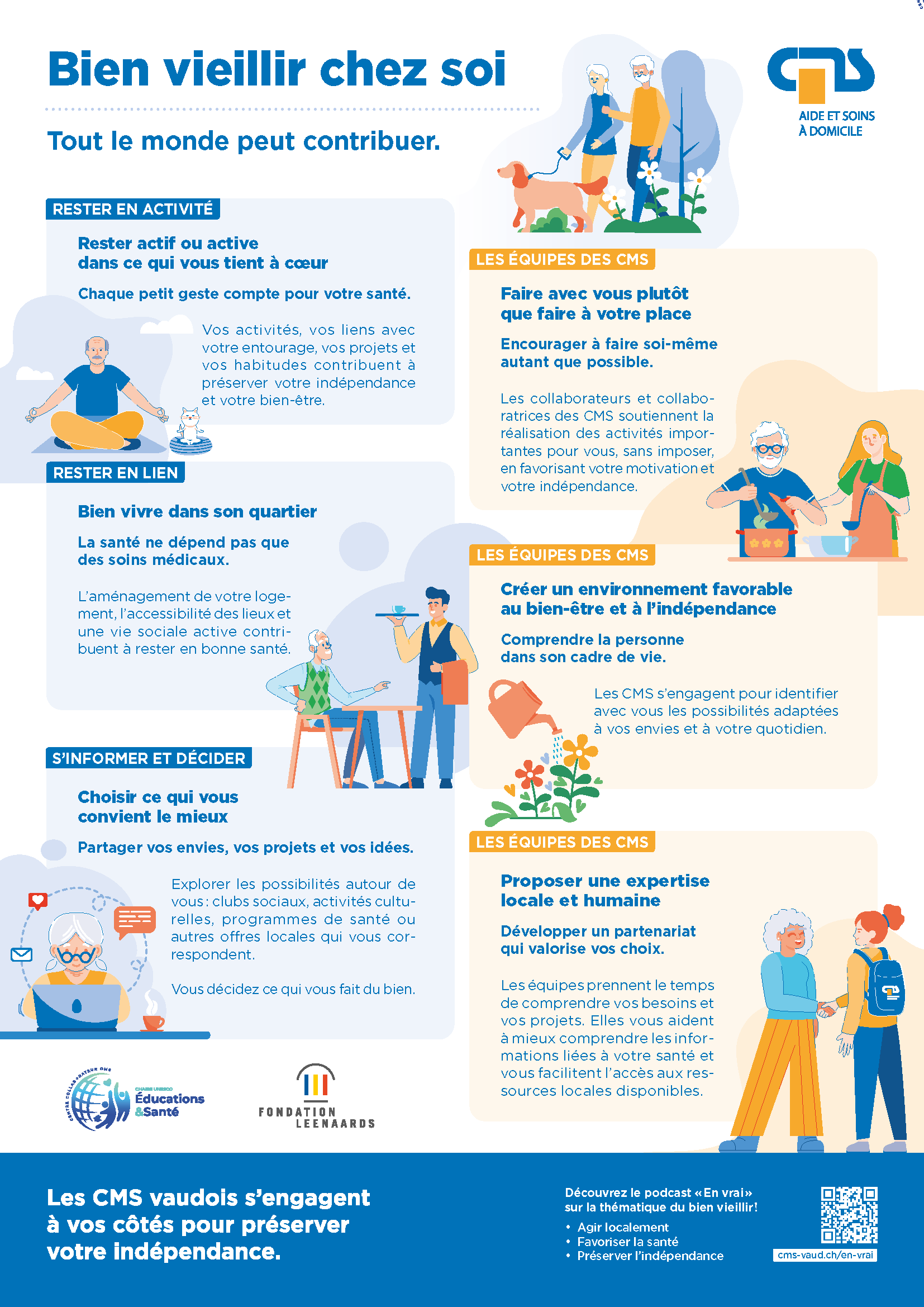Afin de mettre en œuvre cette démarche, il s’est révélé essentiel de renforcer les compétences de tous les professionnel·le·s des CMS dans le domaine de la promotion de la santé. Dans cette optique, le projet «Développement des compétences des professionnels en promotion de la santé» a vu le jour. En partenariat avec la Chaire UNESCO et Centre collaborateur OMS «ÉducationS & Santé», et avec le soutien de la Fondation Leenaards, ce projet a donné naissance à une formation. Élaborée en collaboration avec les professionnels concernés, elle comprend des podcasts destinés au personnel auxiliaire et aux assistant·e·s en soins et santé communautaires (ASSC), ainsi que des modules de formation pour les professionnel·le·s HES. Lancées en juin 2023, ces formations visent ainsi la mise en œuvre progressive d’actions de prévention et de promotion en matière de santé par le personnel au contact des client·e·s, l’objectif étant de favoriser le vieillissement en bonne santé et d’améliorer la qualité de vie des personnes.